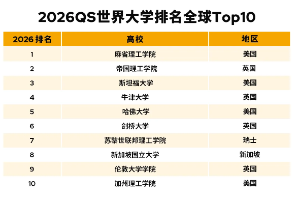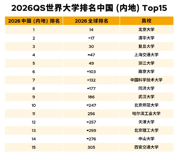 全球高等教育权威评价机构 QS Quacquarelli Symonds(QS)于近日发布了 2026 年世界大学排名。本次排名覆盖 106 个国家和地区的 1500 余所高校,不仅展现了全球顶尖学府的最新竞争态势,也凸显了中国高等教育体系的持续进步。 头部院校格局稳定 麻省理工学院(MIT)连续第 14 年蝉联全球第一,英国帝国理工学院、美国斯坦福大学分别位列第二、第三名,传统欧美强校依然占据主导地位。 中国高校持续攀升 约 45% 的中国内地高校排名较去年提升,5 所高校跻身全球前 100 名:北京大学(第 14 名,稳居内地第一)、清华大学(第 17 名,上升 7 位)、复旦大学(第 30 名,前进 9 位)、上海交通大学和浙江大学均位列前 50。 香港地区高校表现亮眼:香港大学跃升至全球第 11 名,成为亚洲排名最高的院校之一。 区域高等教育新趋势 新加坡国立大学(第 8 名)和南洋理工大学(第 12 名)在国际参与度指标中表现优异,远超日本顶尖高校。 欧洲国家呈现突破:德国高校排名上升数量首次超过下降数量,意大利米兰理工大学首次进入全球前 100 名(第 98 名),创下 G7 国家教育新里程碑。 核心指标表现突出 学术与雇主声誉双提升 :北京大学(学术声誉全球第 12 名)、清华大学(雇主声誉全球第 15 名)均进入全球前 20,复旦大学、浙江大学等在雇主评价中位列前 50。 科研产出实力强劲 :71% 的内地高校在 “师均论文引用” 指标中进步显著,中南大学(全球第 8 名)、华中科技大学(第 10 名)等跻身全球前 15,展现出强大的科研影响力。 国际化与就业领域待突破 国际吸引力不足 :内地高校在 “国际学生比”“国际教职工比” 等指标上平均分较低(如国际学生比平均分 12.3,远低于阿联酋的 84.5),仅暨南大学进入该指标全球前 400 名。 就业成果指标承压 :内地高校就业成果平均分位列全球后 25%,仅 6 所高校进入全球前 250 名,与美英等国存在差距。 区域发展不平衡 一线城市高校(如北京、上海)占据上榜院校的 53%,且排名下降比例较低;非一线城市高校虽占比 47%,但排名上升比例仅为 38%,反映出资源分布与发展潜力的差异。 QS 高级副总裁 Ben Sowter 指出:“中国内地高校在教学质量和研究实力上已取得显著进步,尤其是北大、清华等顶尖学府的全球竞争力持续增强。” 他同时建议,内地高校需进一步提升国际化水平,扩大国际学术合作与人才吸引力,例如浙江大学在 “国际研究网络”、同济大学在 “国际教职工比” 中的探索值得借鉴。 “未来,持续的资源投入与体系创新,将助力更多中国高校达到全球学生、研究者和雇主的期待,在快速变化的高等教育格局中巩固领先地位。” 完整排名及更多教育资讯,可登录 QS 官方网站或关注官方平台获取。 本文内容基于公开信息整理,数据以 QS 官网最终发布为准。如需转载,请注明来源并遵循相关版权规范。